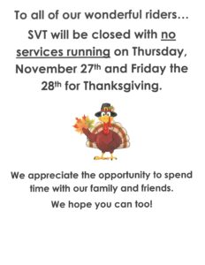 - If you are a new rider, SVT collects some basic information about you. This is entered into our routing system so that rides can be easily booked in the future. Information is not shared outside of SVT.